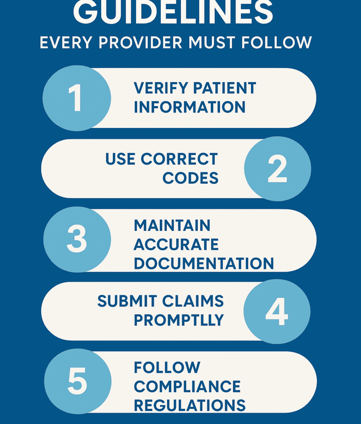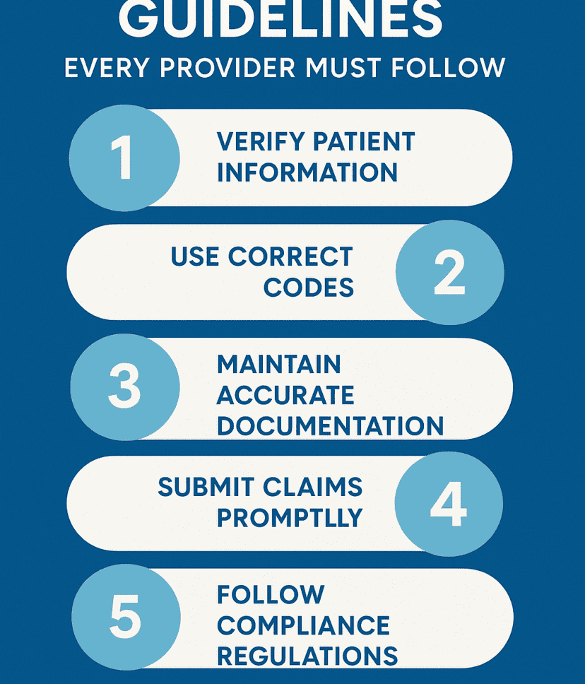 Billing guidelines are structured rules that ensure healthcare billing is accurate, compliant, and timely.