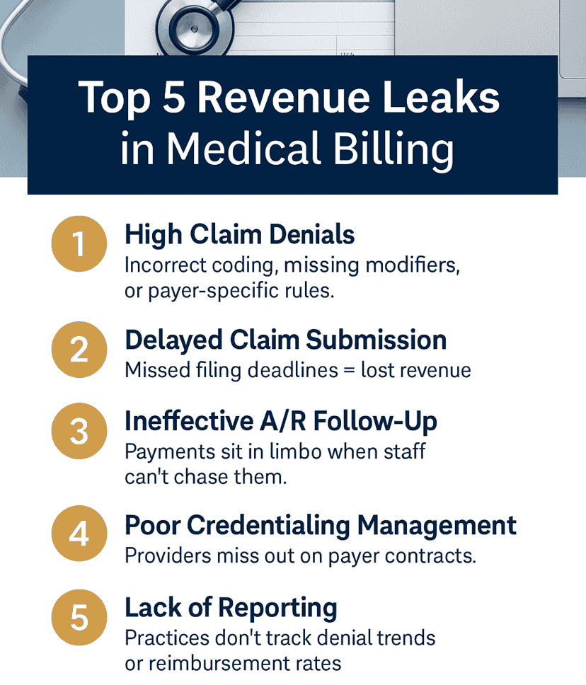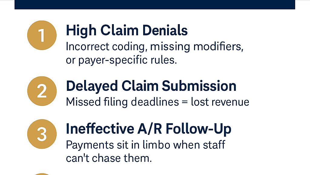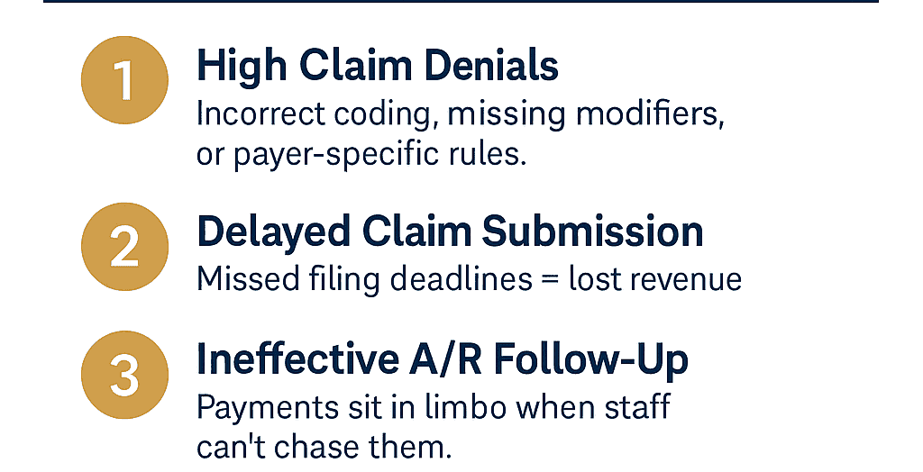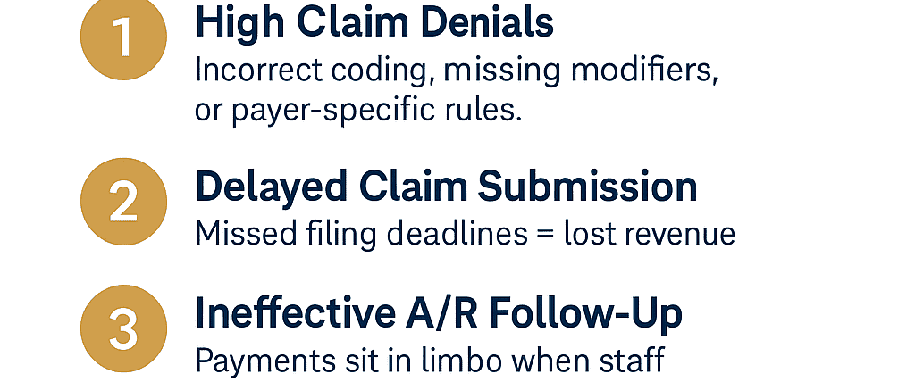 Small inefficiencies add up to big financial losses. By tightening your revenue cycle with denial management, A/R recovery, credentialing, and smarter reporting, you can stop revenue leaks and protect your practice’s cash flow.