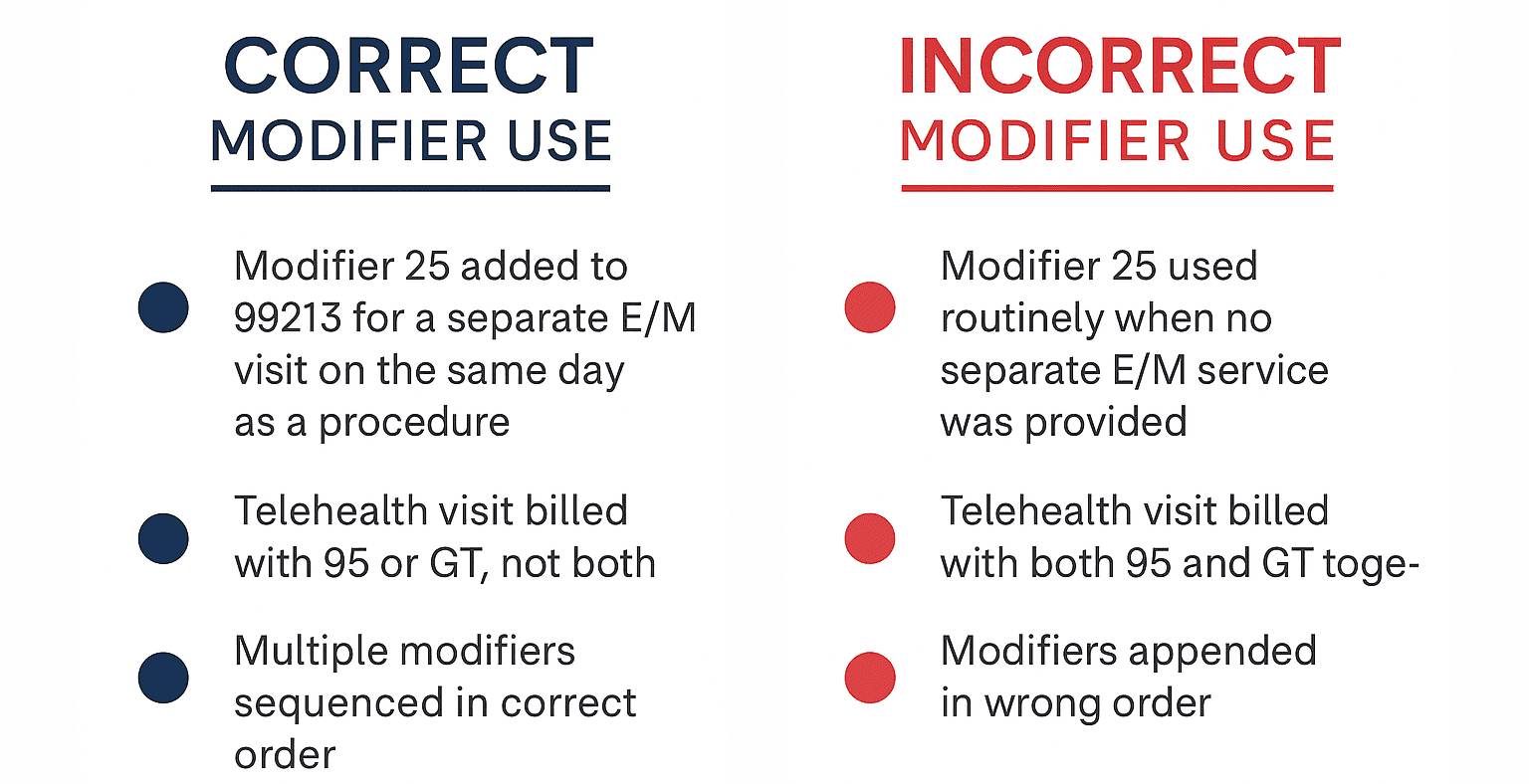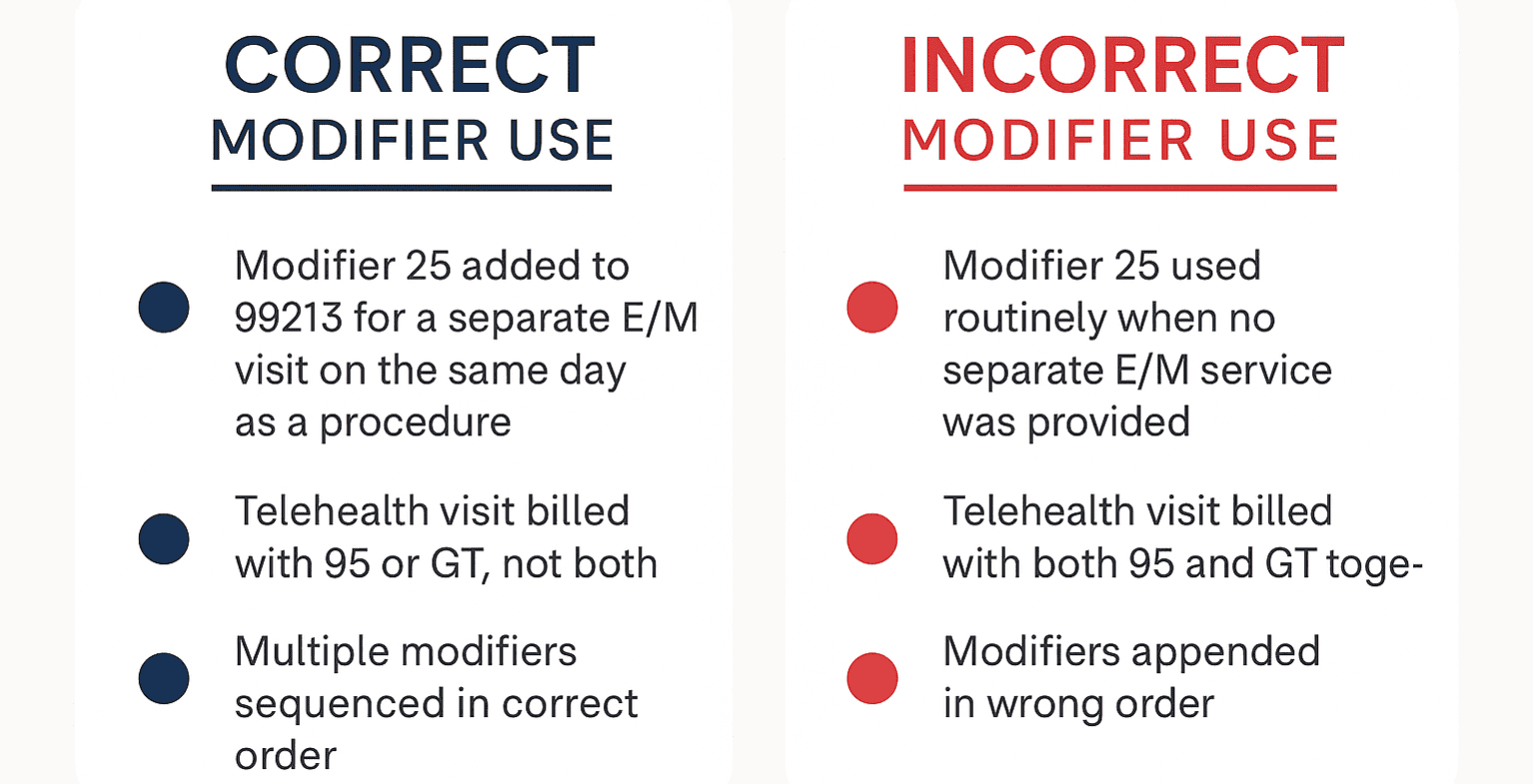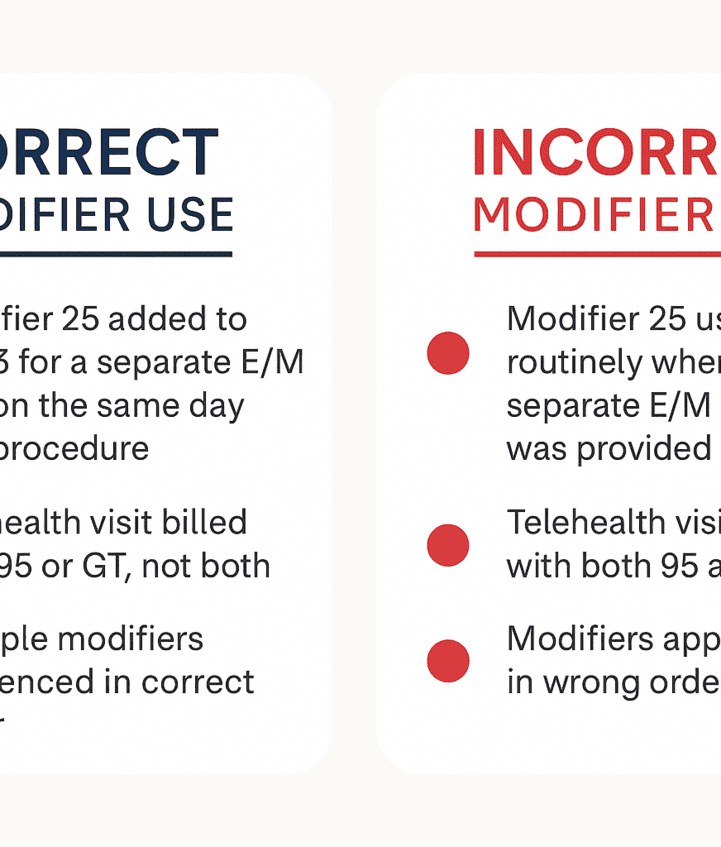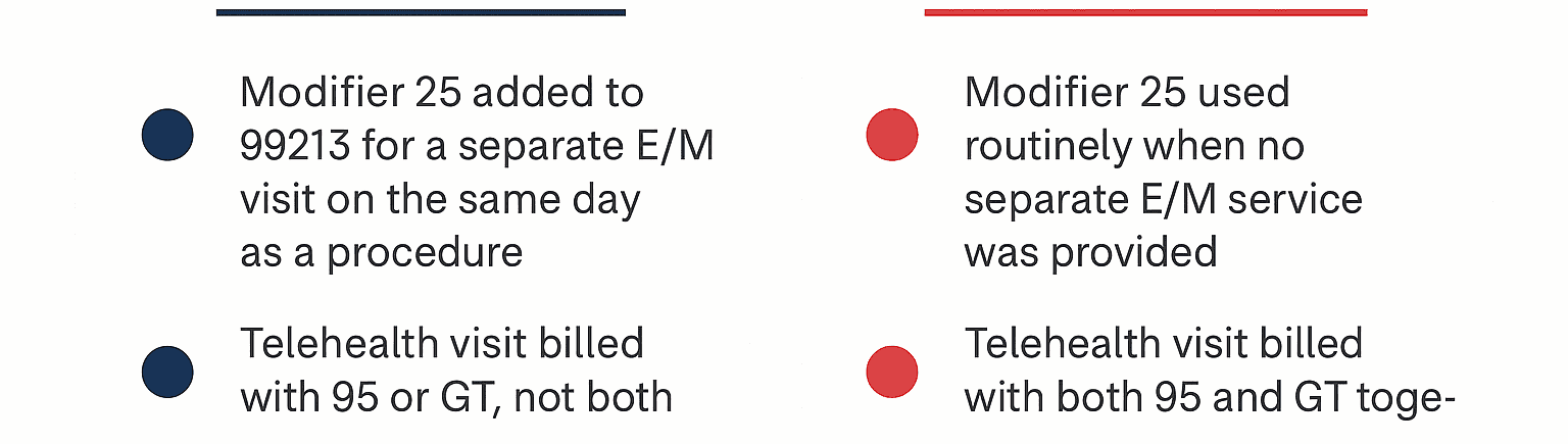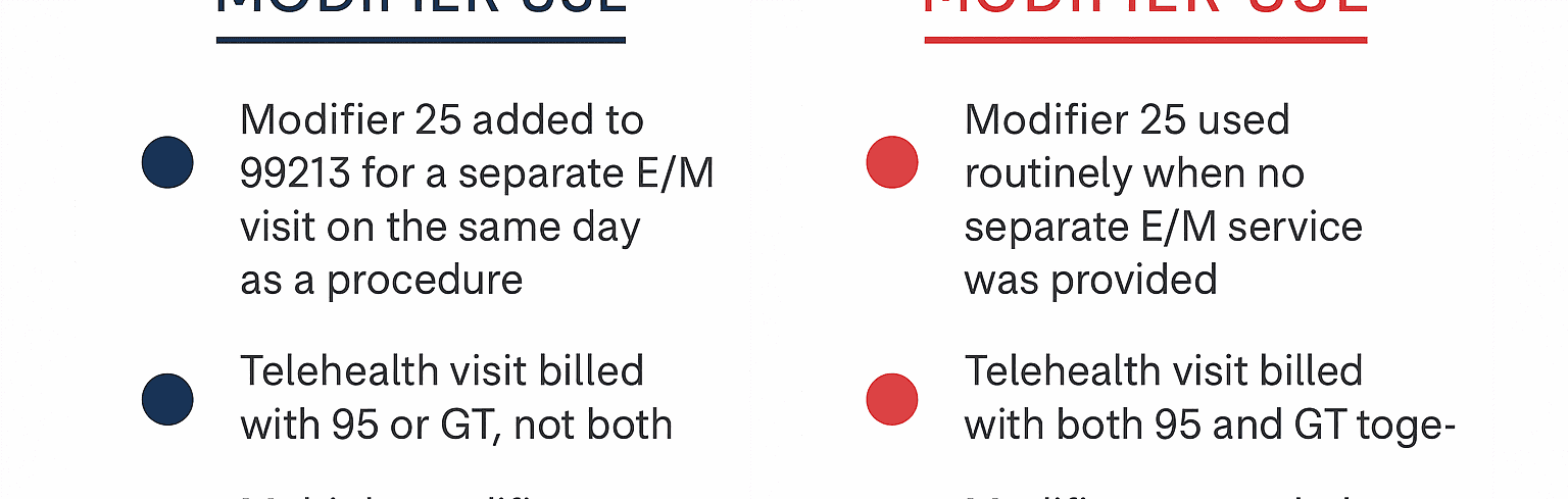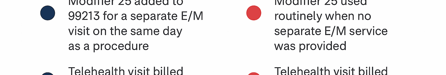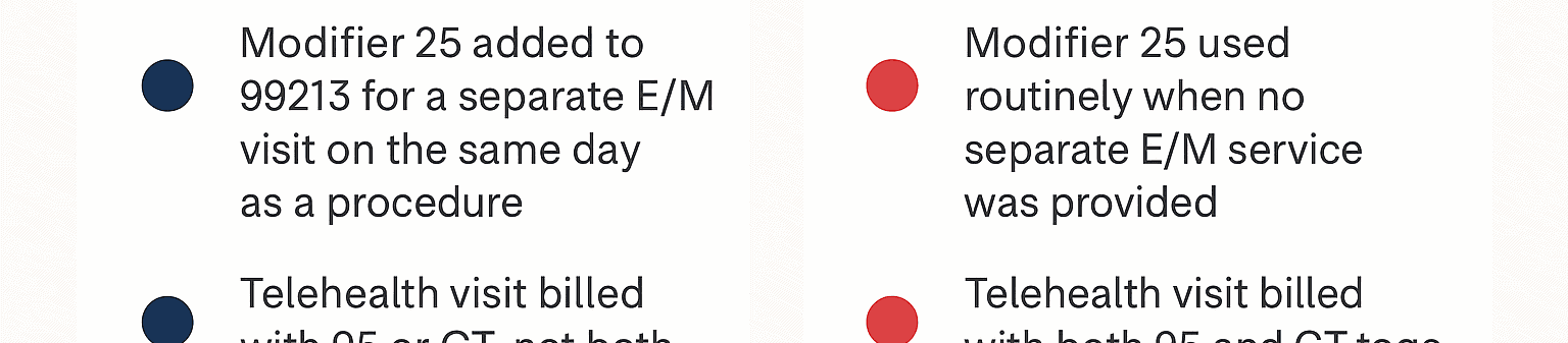 • Impact: Overuse of Modifier 25 raises red flags with insurers, leading to denials or audits.