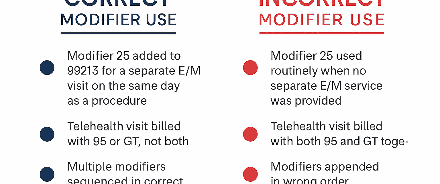 Impact: Even if the right modifiers are used, the wrong sequence can lead to claim rejection.